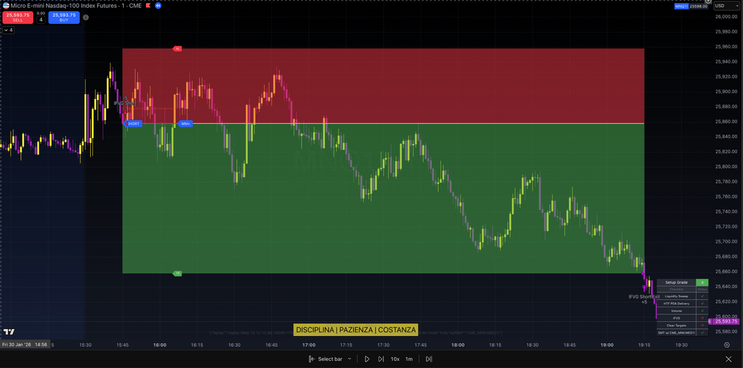 Include grading checklist (A+→D), overlay HTF FVG, gestione trade/limiti giornalieri e position sizing a rischio % per esecuzioni pulite e replicabili.